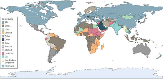 Cancer type with the largest economic cost in 2020–2050 for each country